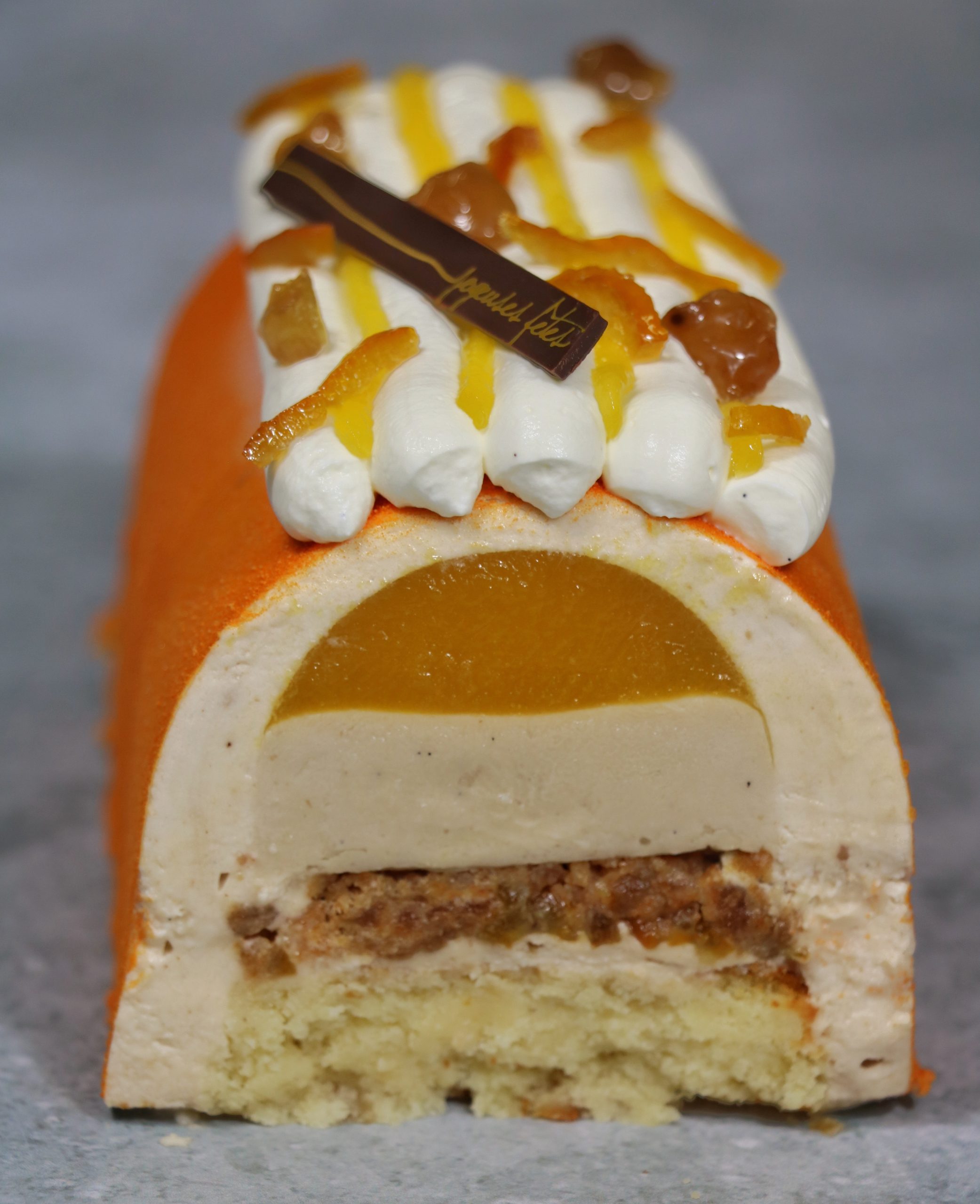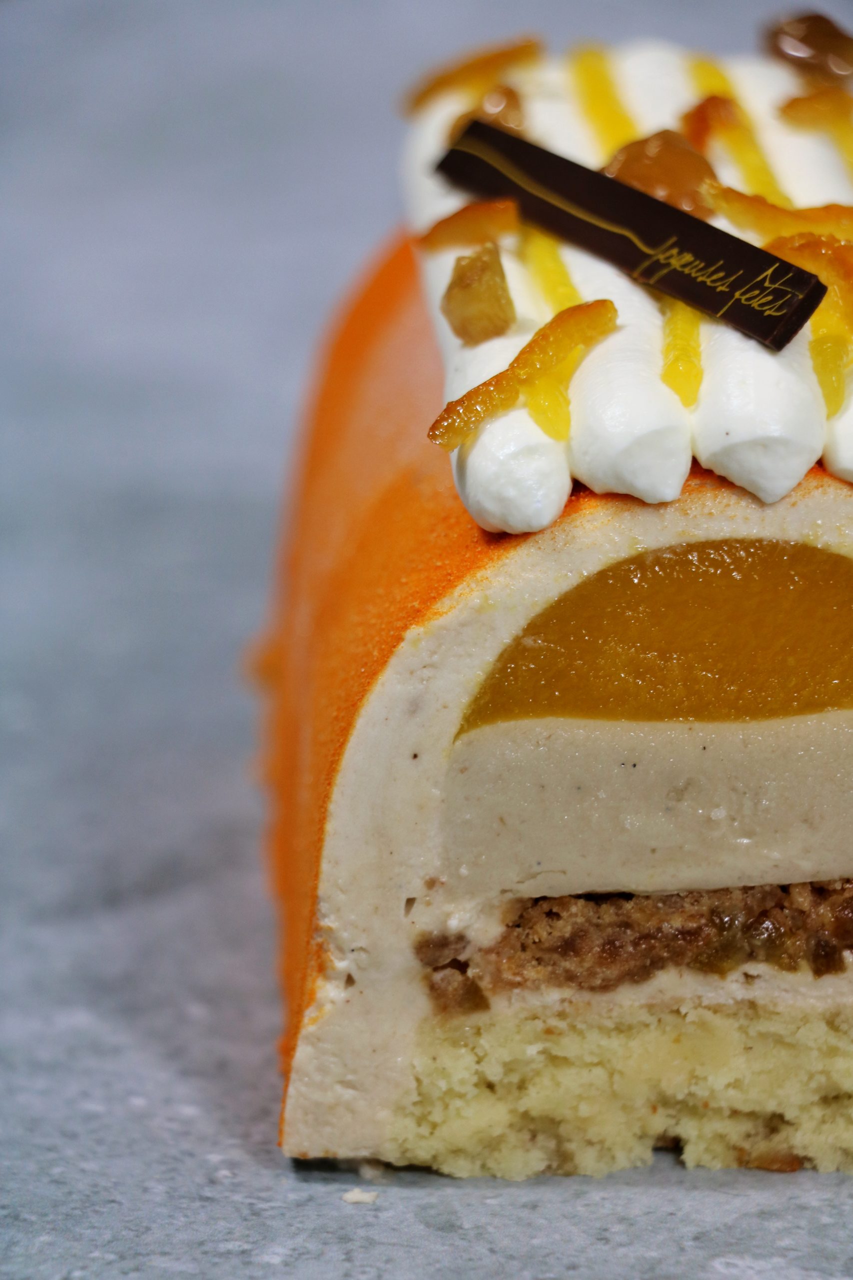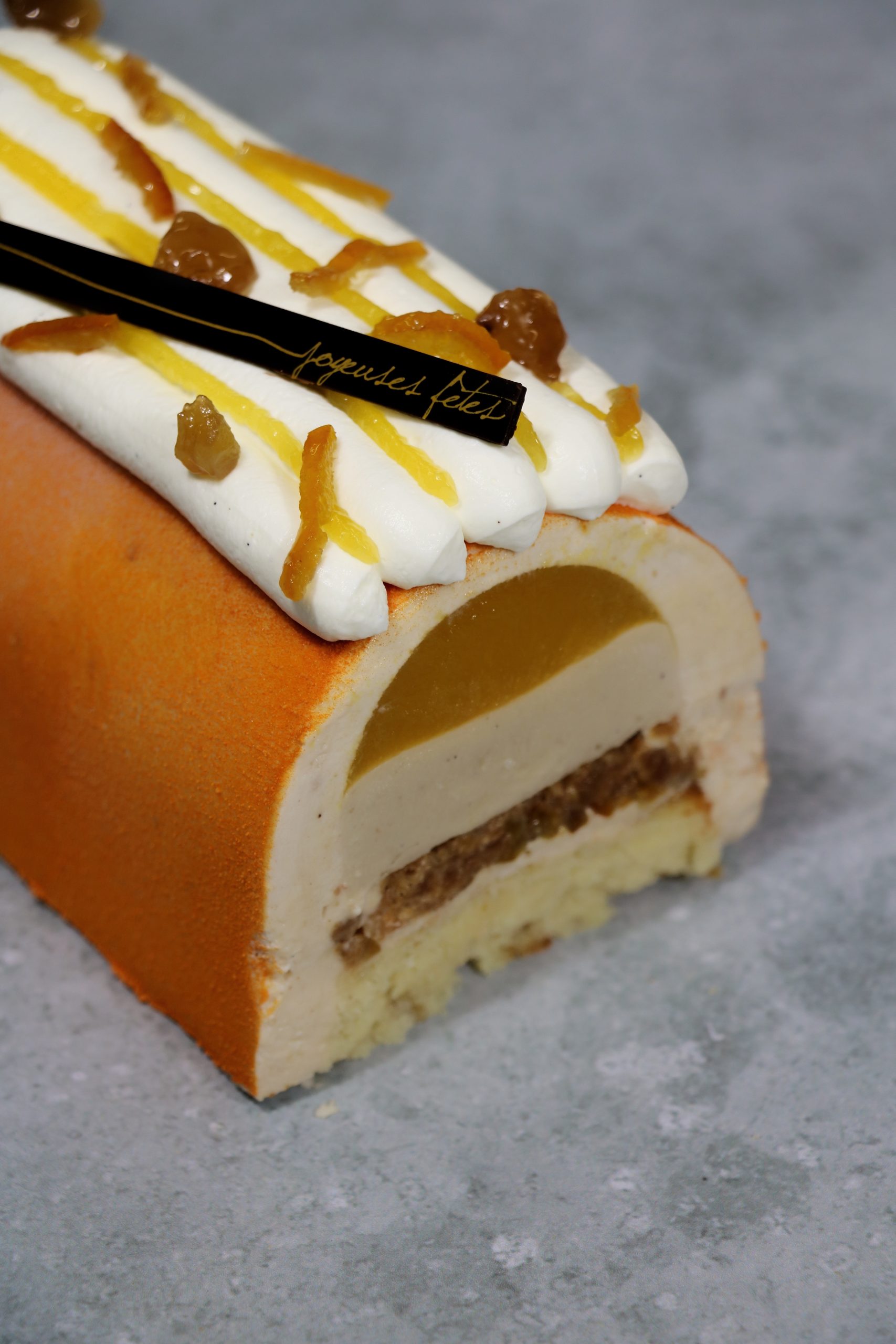 Une bûche gourmande, élégante et sophistiquée, où le mariage marron–mandarine offre un équilibre parfait entre douceur et éclat fruité.