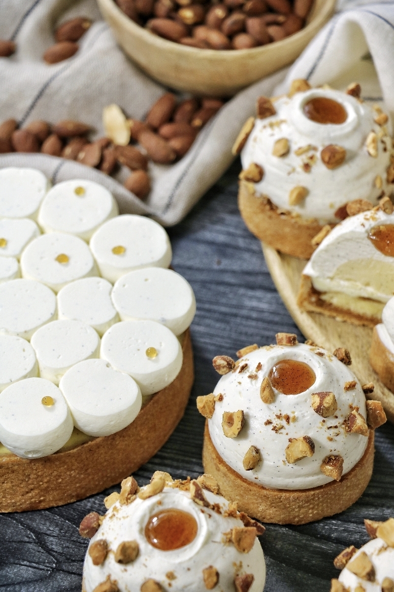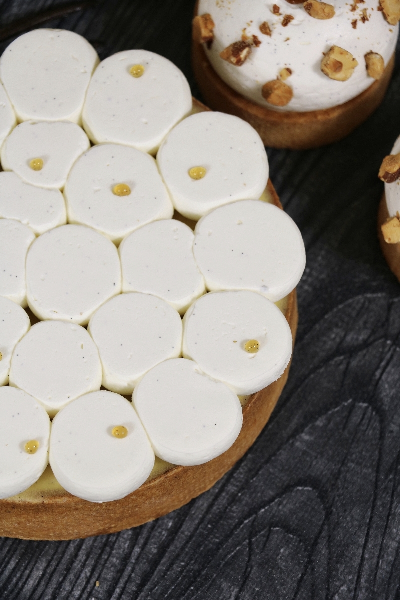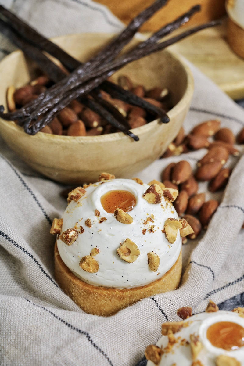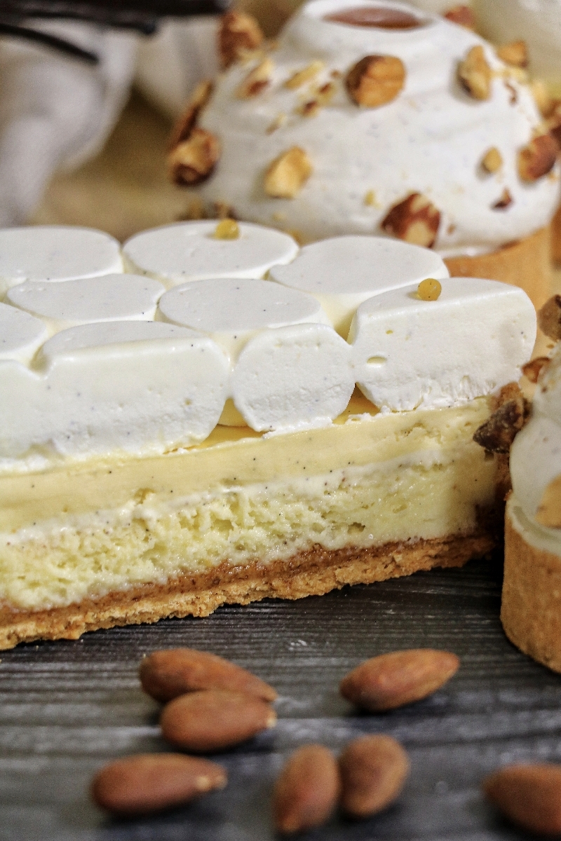 Pâte sucrée, praliné amande, biscuit moelleux à la vanille, ganache moelleuse à la vanille bourbon, mousse légère au mascarpone et à la vanille bourbon. Allergènes : Gluten, lait, œufs, amandes.
